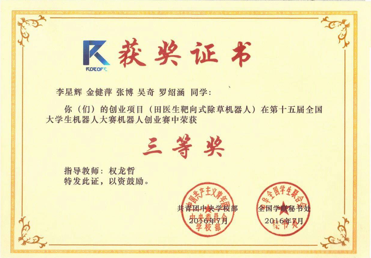 指导教师:权龙哲 《田医生靶向式除草机器人》 三等奖 2016年
