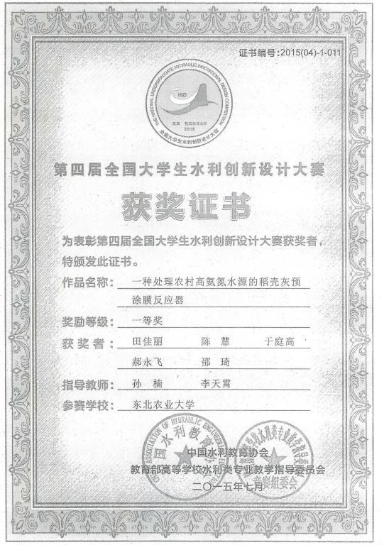 指导教师:孙楠 《一种处理农村高氨氮水源的稻壳灰预涂膜反应器》 一等奖 2015年